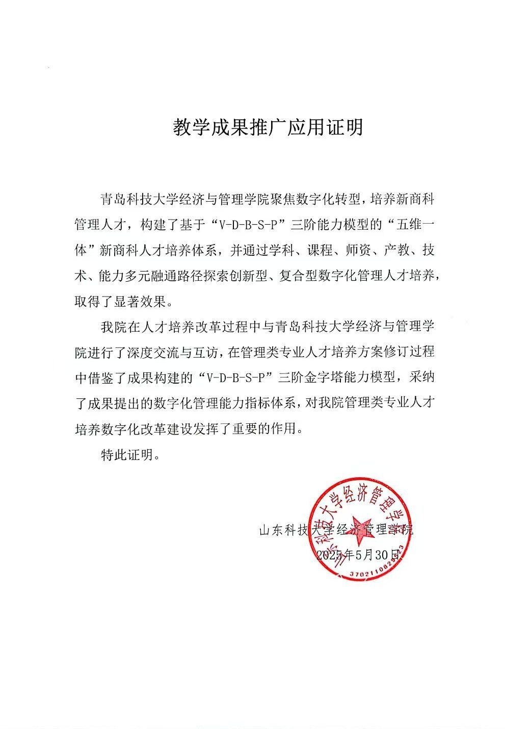 教学成果顺应数字化转型趋势,面向数字经济新需求,依托2项省教改重点项目,在传统能力模型基础上,拓展数字化新维度,构建了基于“V(价值引领)—D(数字化能力)—B(基础能力)—S(专业能力)—P(综合解决问题能力)”三阶能力新模型。以能力模型为基础,搭建面向数智化管理变革的课程体系(C)、具有数智化能力素养的教师队伍(T)、依托数智化载体的多渠道教学资源、融合数智化技术的专业课堂教学(C)、基于数智化平台的专业实验实训项目(E)的五维一体管理人才培养新体系,对管理类专业进行一体化协同改革和系统优化(2020年省教改重点项目)。通过探索“学科融通”、“课程融通”、“师资融通”、“产教融通”、“技术融通”、“评价融通”等多元融通新路径(2022年省教改重点项目),突破数字经济时代管理人才培养困局,推进新商科管理教育数字化转型。
